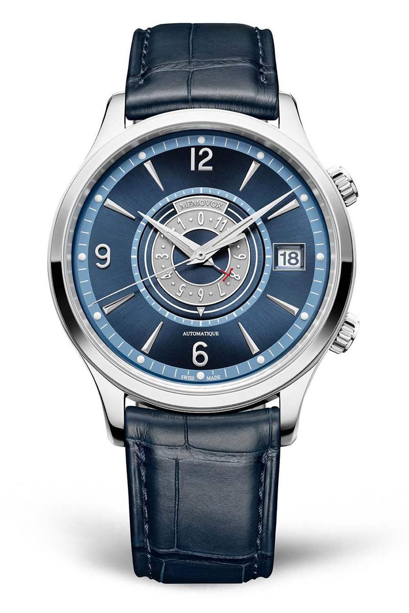 永久模型 Master Control Memovox 非常適合它的四個復雜的穩定器。這意味著一個 40 毫米的不銹鋼表殼和一個內斂的——更不用說非常可愛的——帶有藍色中央秒針的同色調表盤。