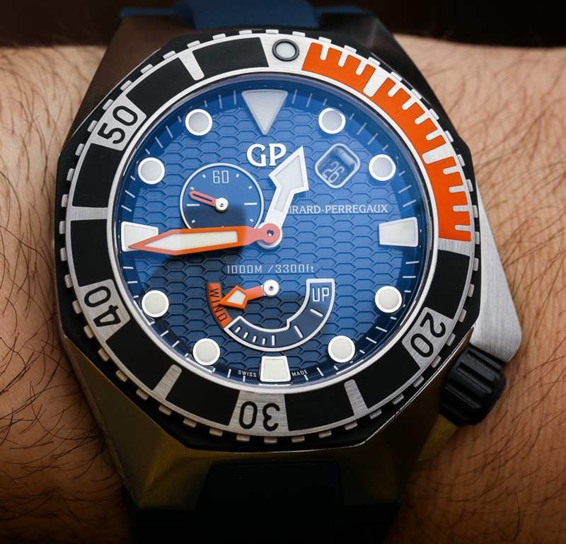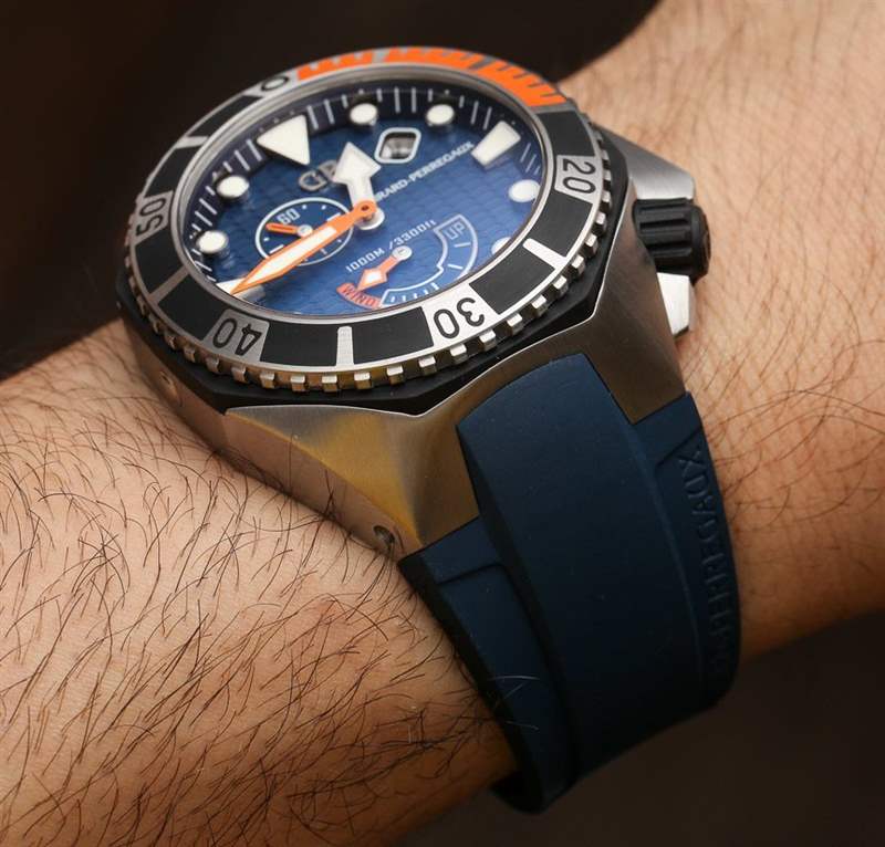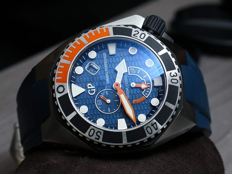Girard-Perregaux Sea Hawk 表殼采用鋼材制成,尺寸為 44 毫米寬,但考慮到寬大的表耳和 17.1 毫米的表殼厚度,它確實(shí)磨損很大。表殼防水深度達(dá) 1000 米,帶有排氦閥,手表內(nèi)部是芝柏表自制的 GP03300-0074 自動(dòng)機(jī)芯。它上面有一個(gè)模塊,提供額外的功能,如動(dòng)力儲(chǔ)存指示器、日期和輔助秒盤(pán)。雖然不對(duì)稱(chēng),但表盤(pán)仍然很平衡。我也很喜歡帶有動(dòng)力儲(chǔ)存指示器的潛水表。順便說(shuō)一句,它具有 46 小時(shí)的動(dòng)力儲(chǔ)存,并以 4 赫茲的頻率運(yùn)行。
