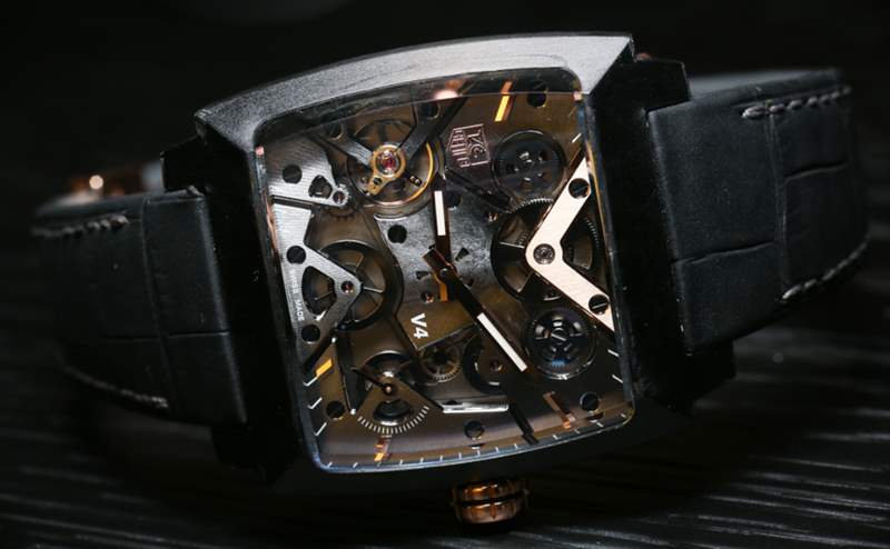 這件作品有一個不會變舊的表盤。令人驚嘆的設計證明了人們最初想要與 Ruchonnet 合作的原因。Monaco V4 將傳統機械元素與現代設計融為一體,是炫耀您作為手表迷身份的“酷”方式。從功能上講,它只顯示時間、小時和分鐘以及位于 4 點鐘位置的小秒盤。手表背面的事情變得越來越有趣。