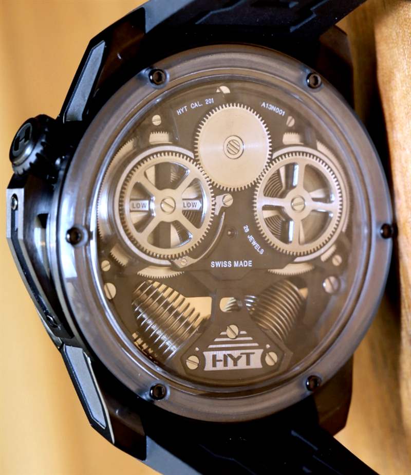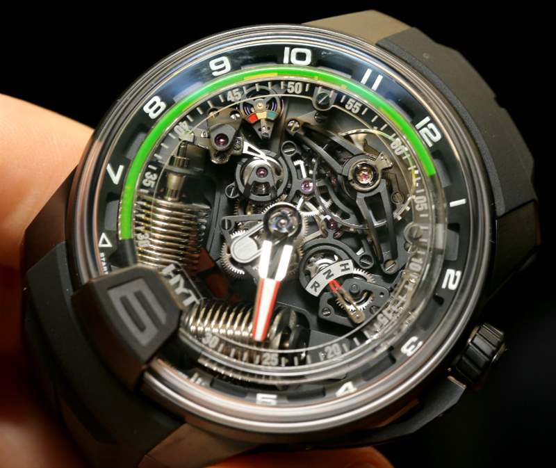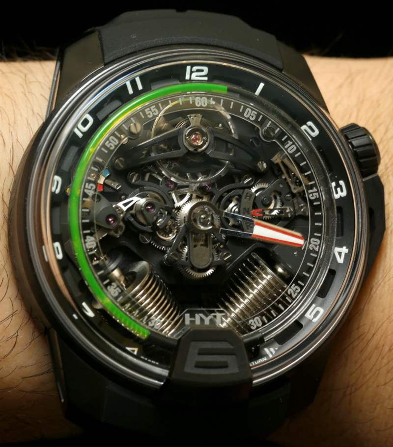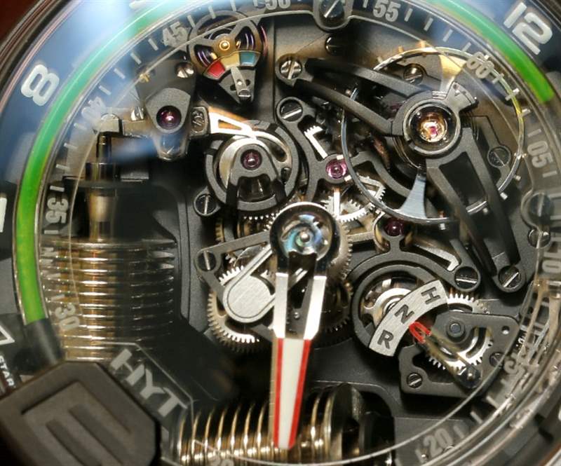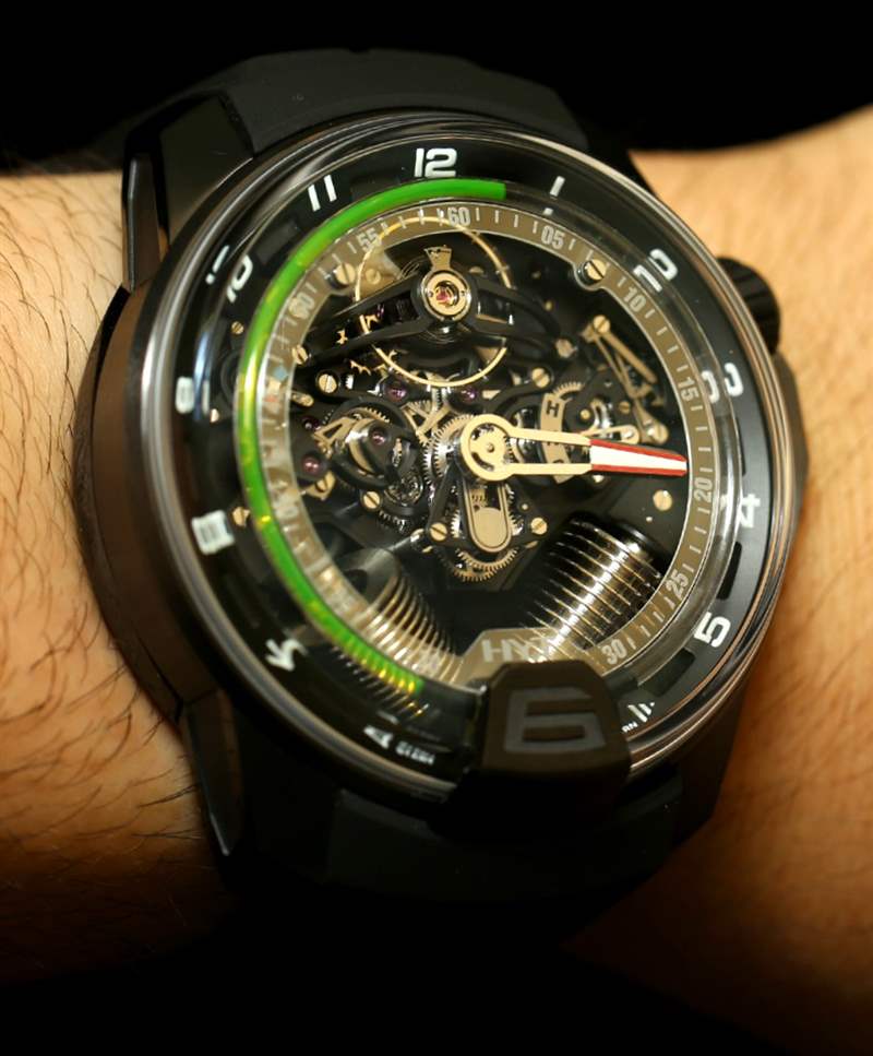 如果您閱讀過(guò)我們首次發(fā)布 H2 的文章,您就會(huì)了解其近 49 毫米寬的尺寸和黑色 DLC 涂層鈦金屬表殼。在手腕上,它不僅感覺(jué)像一個(gè)小型發(fā)動(dòng)機(jī),其新對(duì)角對(duì)齊的波紋管的方向就像發(fā)動(dòng)機(jī)中的活塞。波紋管是液體小時(shí)系統(tǒng)的一部分,并與運(yùn)動(dòng)一起使用壓力移動(dòng)液體以指示小時(shí)。分鐘顯示在一個(gè)更大的中央分針上,它完全跳過(guò)表盤(pán)的底部,就好像它根本不存在一樣。它是跳分針的一種形式。表盤(pán)頂部附近還有一個(gè)大的外露擺輪。它看起來(lái)很棒,但如果他們將陀飛輪扔進(jìn)鍋里,很可能已經(jīng)毀了。廣告留言廣告信息結(jié)束